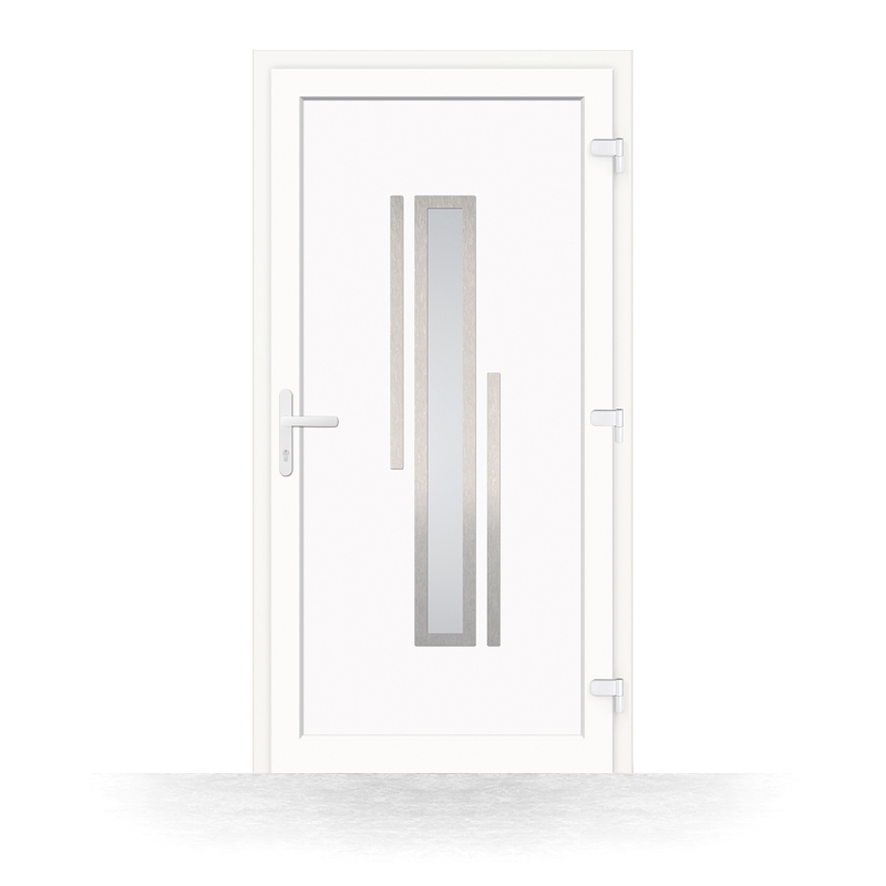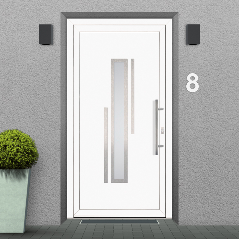 The Minneapolis front door model stands for energy-efficient and stylish workmanship: the glass insert impresses with its understated elegance - no frills required - and is underscored by the stainless steel lines on the outside. UPVC is known as a versatile and uncomplicated material: it easily withstands the elements and does not lose its attractiveness even years afterwards. As opposed to wood, for example, which requires constant maintenance. The Minneapolis model uPVC front door truly is an asset for every house.