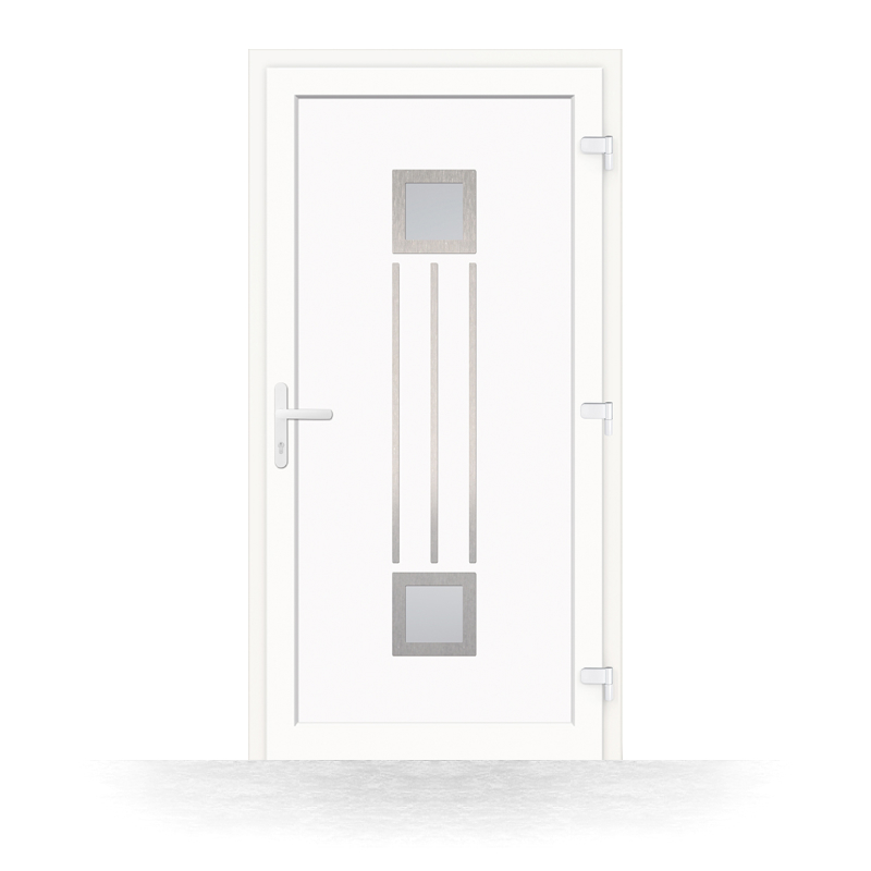 There is a lot to be said for the choice of front doors made of uPVC: Not much effort is required in terms of care - even without a special coat of paint, their surface is hardly affected by wind and weather. Thanks to the integrated steel core and innovative chamber profile system, the Wellington uPVC front door is stable, safe and well insulated. The positive properties of uPVC are in a great relationship to the price. The uPVC Wellington door model also stands out in terms of design: Two glass elements set in a metal frame and three fine central lines made of stainless steel give this door an exclusive look.