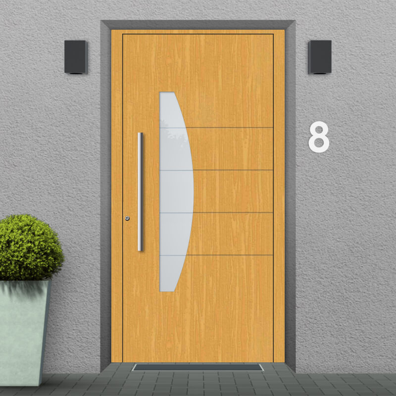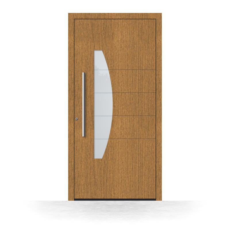 The Atlanta front door enhances the entrance to any home with its generous, slightly arched glass insert, its sash-covering panel and its outstanding thermal and sound insulation properties. It guarantees plenty of light and excellent operating comfort without compromising on solid break-in protection. You can choose between three wood types and select a colour option and a type of glass. Frosted glass offers added privacy, while security glass is highly recommended for large expanses of glazing due to the break-in protection it provides. You can use the configurator to make your selection.