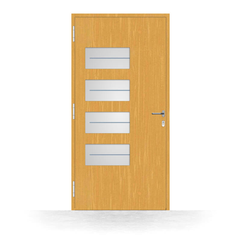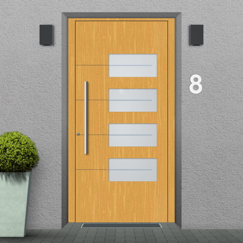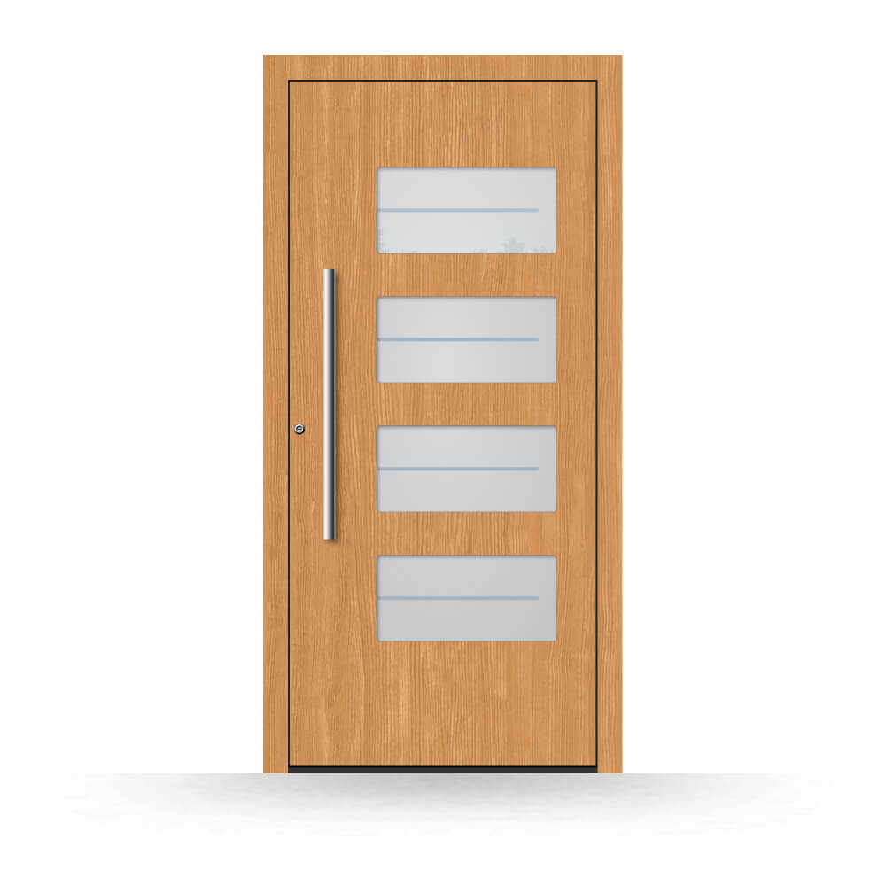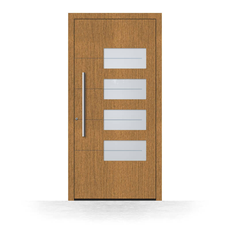 Wooden front doors are not normally something you associate with modernity – they have been around for as long as houses have existed, after all. Nevertheless, the Austin model succeeds in combining classic features with contemporary design and four glass inserts. When it comes to functionality, contemporary front doors made of wood are also still very competitive indeed. For example, their excellent thermal insulation values hold up well in comparison with doors made of aluminium and uPVC. The Austin model immediately catches your eye with its generously proportioned glass inserts.