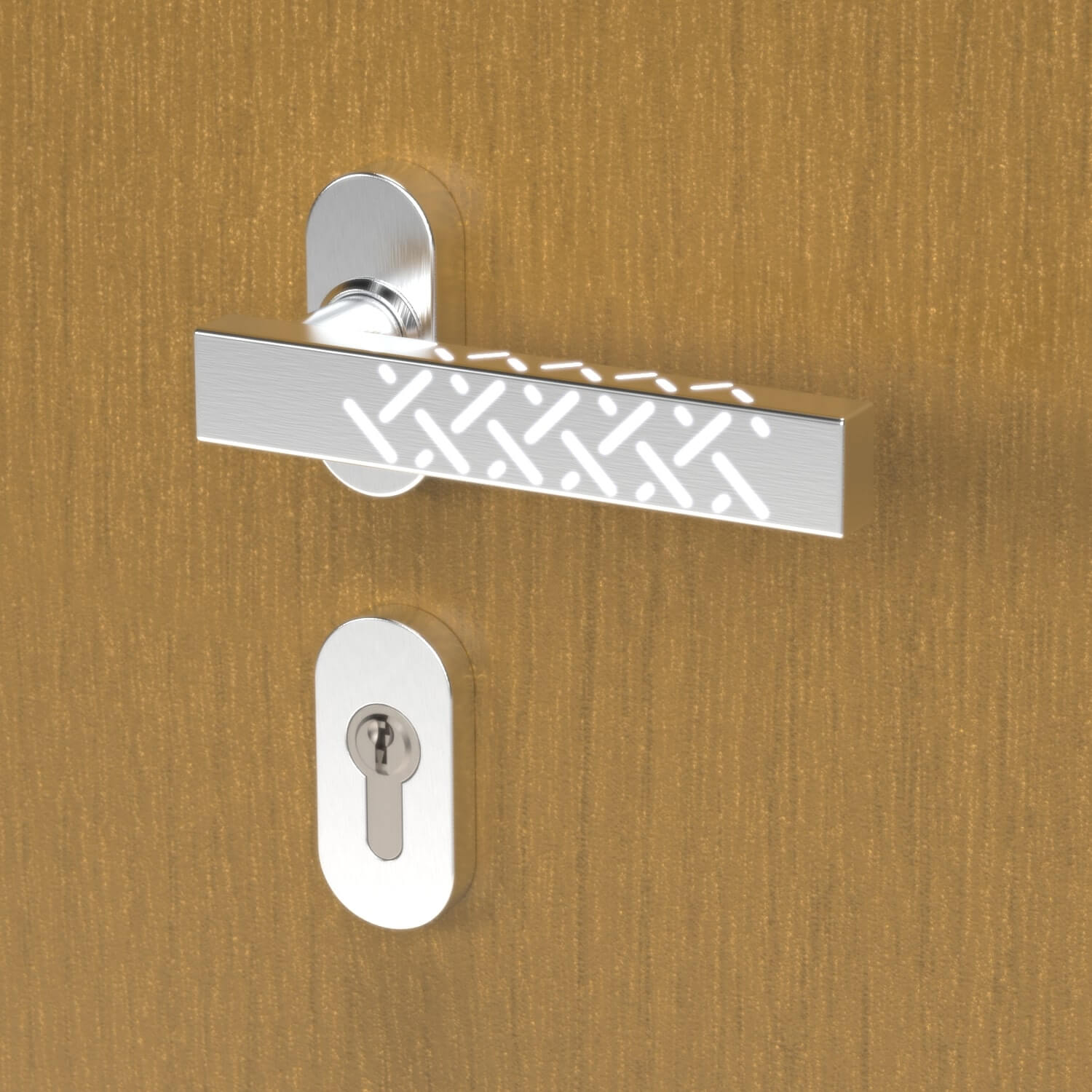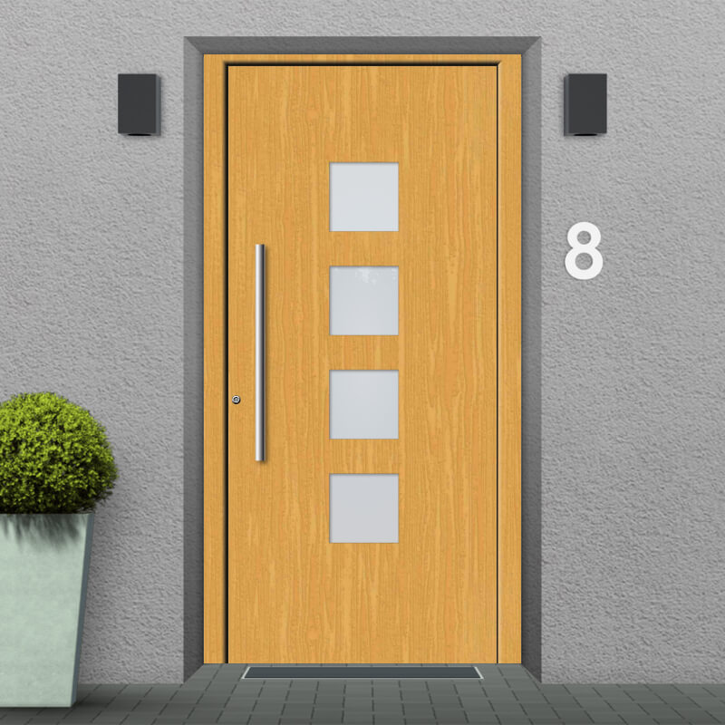 The design of the Baltimore front door is based on four square glass inserts stacked on top of one another. They are arranged strictly symmetrically in a central line and radiate a clear, calm structure. Customise the glass inserts to your liking so you can either see through or admire the charming exterior through diffused glass. Another optical highlight can be set by LED lighting in the outside handle. This not only increases visibility, but also creates a very special charm in the evening light.