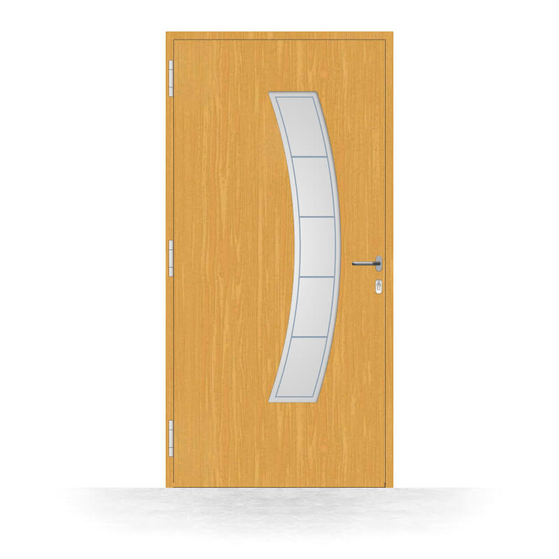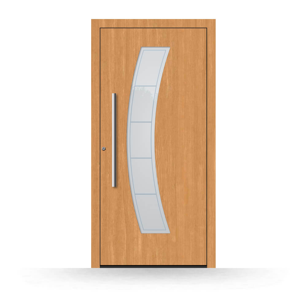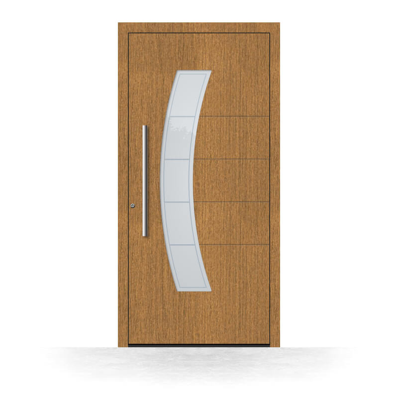 In terms of design, the wood door variant is absolutely in flux. Its lines and curves make it stand out visually from other models. The glass insert draws attention to itself with its unusual, curved design. There are also horizontal relief grooves and a door handle that fits parallel to the glass element.