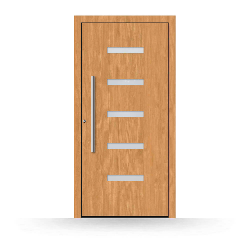 The Canberra model is a special example from the wooden front door category. With five narrow glass inserts that are positioned horizontally within the door, this door's components guarantee a welcoming, stylish aesthetic. It is therefore easy for you to look out into the garden without revealing too much of the house's interior. After all, a front door should also protect against prying eyes. As with all wooden front doors that are offered on windows24.com, only the best grade A wood is used to manufacture these front doors. By choosing a Canberra wooden front door, you are taking the first step towards creating your dream home.