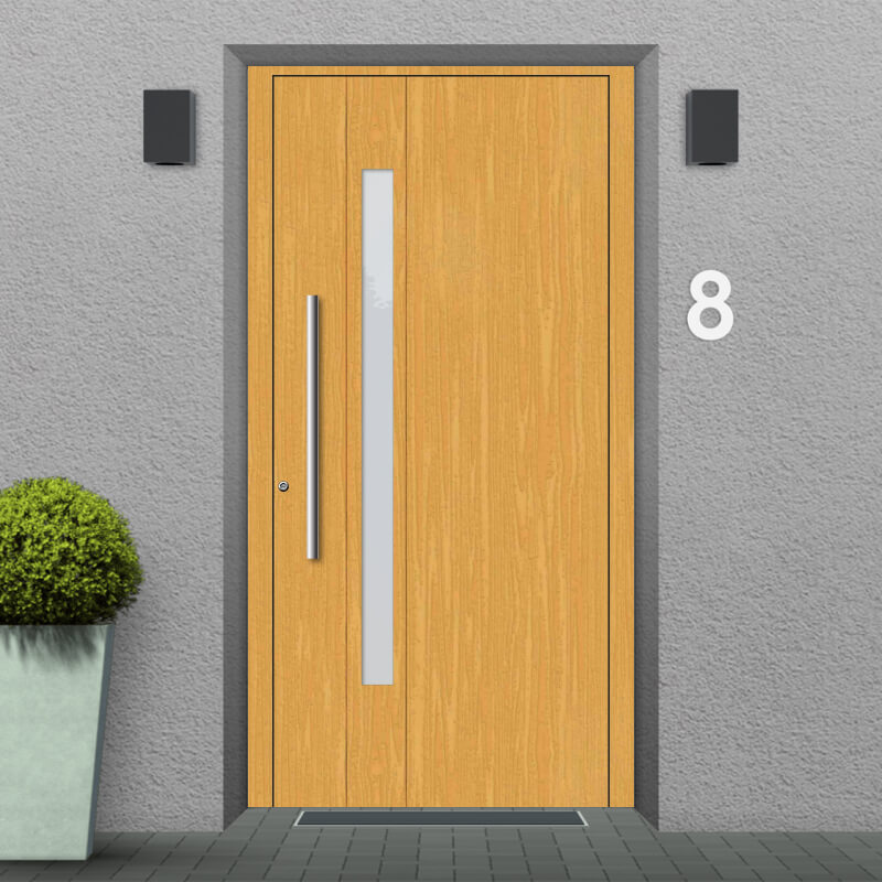Visually, the Las Vegas front door scores with its simple elegance. Straight lines and a narrow, vertically elongated glass insert dominate the modern look. The relief grooves that frame the glass on the left and right act as a deliberate accent. The model is particularly versatile thanks to its wide range of colours. Almost everything is possible here, from RAL standard colours to custom colours. Especially with wood, we recommend avoiding the use of opaque varnishes, but to work with colours that preserve the natural grain.
