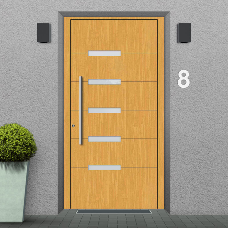 The woods oak, larch and spruce are among the classic basic materials for the Liverpool front door and impress with a warm look and good functional properties. To optimize this, a steel core is inserted using the sandwich method, which makes the door particularly robust. Thermal insulation is also important. A corresponding insulation core is supplemented with a thermally separated door sill and high-quality silicone seals, which have no weak points on the edge of the wooden door. The combination creates an extremely durable product that is not only efficient in terms of heating costs but also offers the necessary security. The natural wood aesthetic complements the whole thing optically.