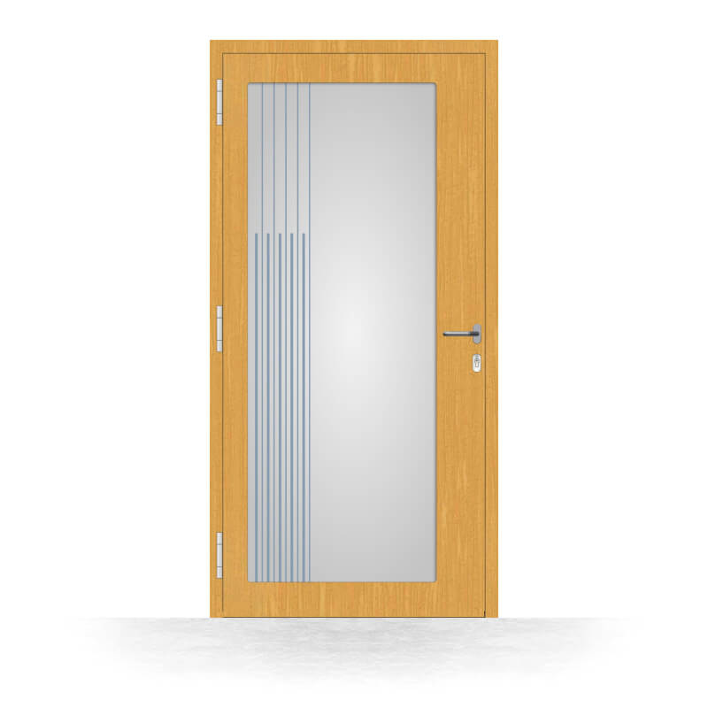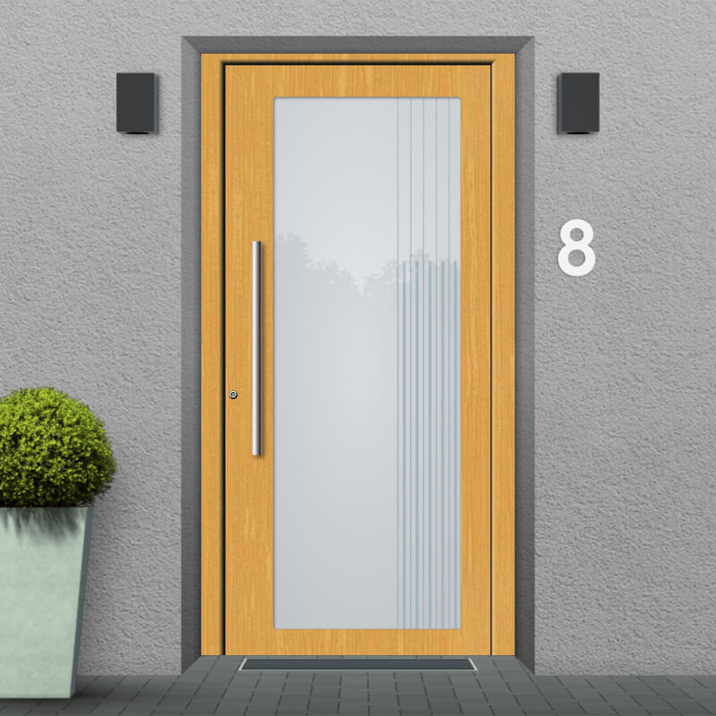 Our Louisville model wooden front doors have a lot of character: Their large, central glass insert amplifies the inviting natural charm that all wooden front doors exude. They let in a great deal of natural daylight, creating a bright, friendly environment without compromising on safety, durability or stability. All in all, our Louisville model modern wooden doors offer high quality at a reasonable price, allow for uncomplicated installation and convey a sense of charm and style that will add a unique touch of joie de vivre to your life.