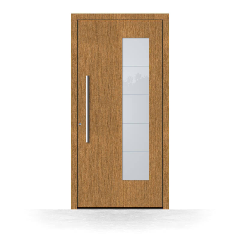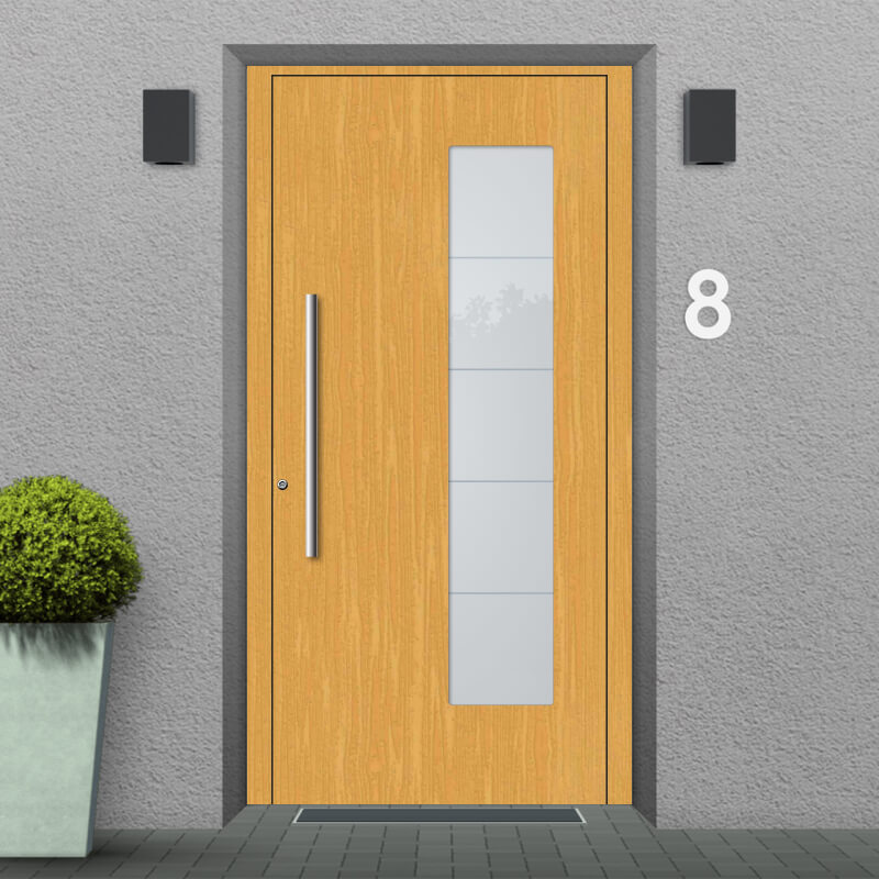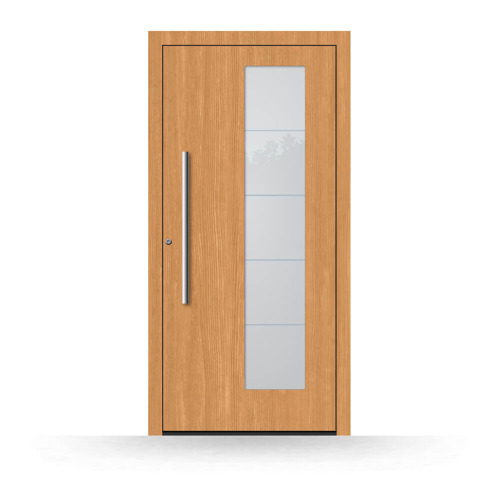 A highlight in terms of design is this door's generous, vertical glass section. It makes these wooden front doors look welcoming and inviting. You can also choose the type of glass you want.