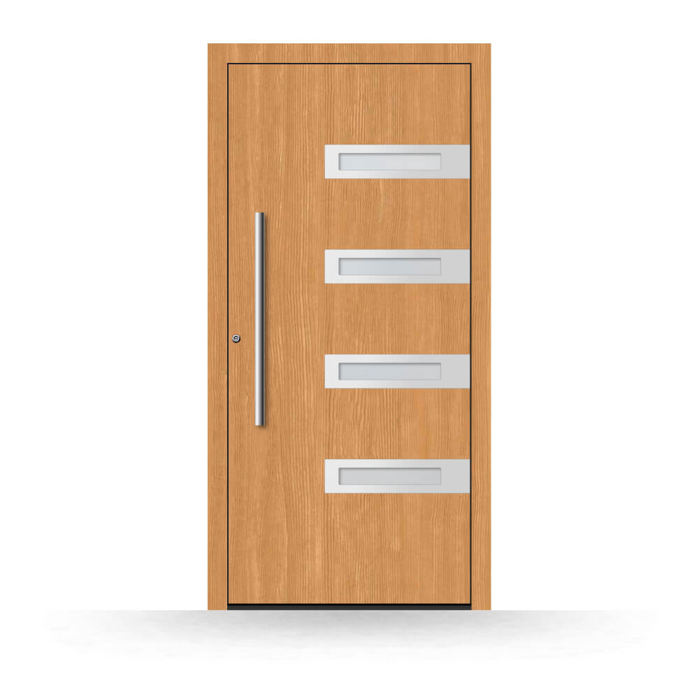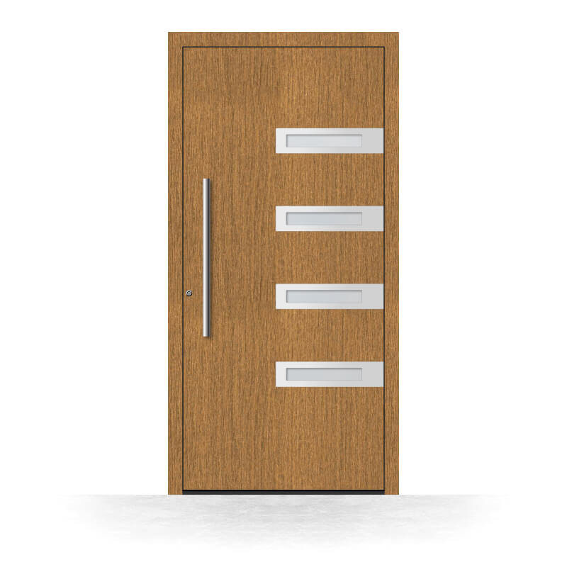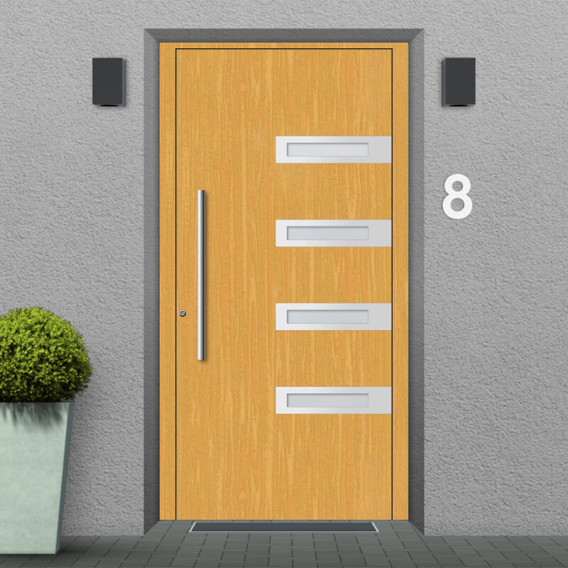 The Newark front door reflects the style of elegant modernity without appearing overly futuristic. It consists largely of natural wood and is only broken up by a few accents. This includes glass elements grouped parallel to each other. They are unobtrusive and are each framed by a stainless steel panel that extends approximately to the middle of the door. The opposite side has the generous door handle, the size of which can be adjusted in the configurator.