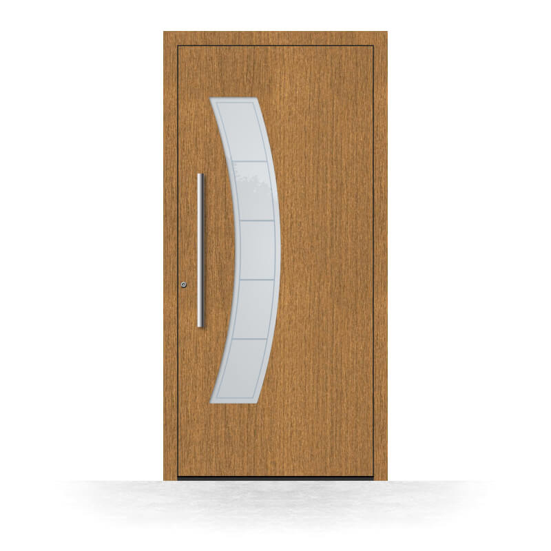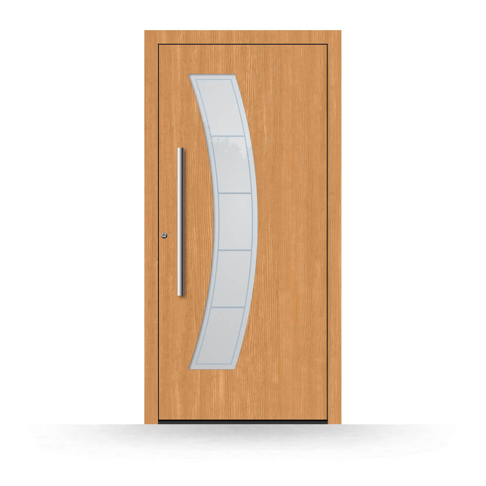 The Riverside model front door with its clean design immediately catches your eye with its large, curved glass insert. The modern design can be combined such exquisite, classic timbers as spruce, oak and larch. You are also free to choose the dimensions, glazing and profile you would like. Front doors made of wood feature excellent sound and thermal insulation values and are particularly robust – as well as being the natural choice, they also score good marks for their performance.