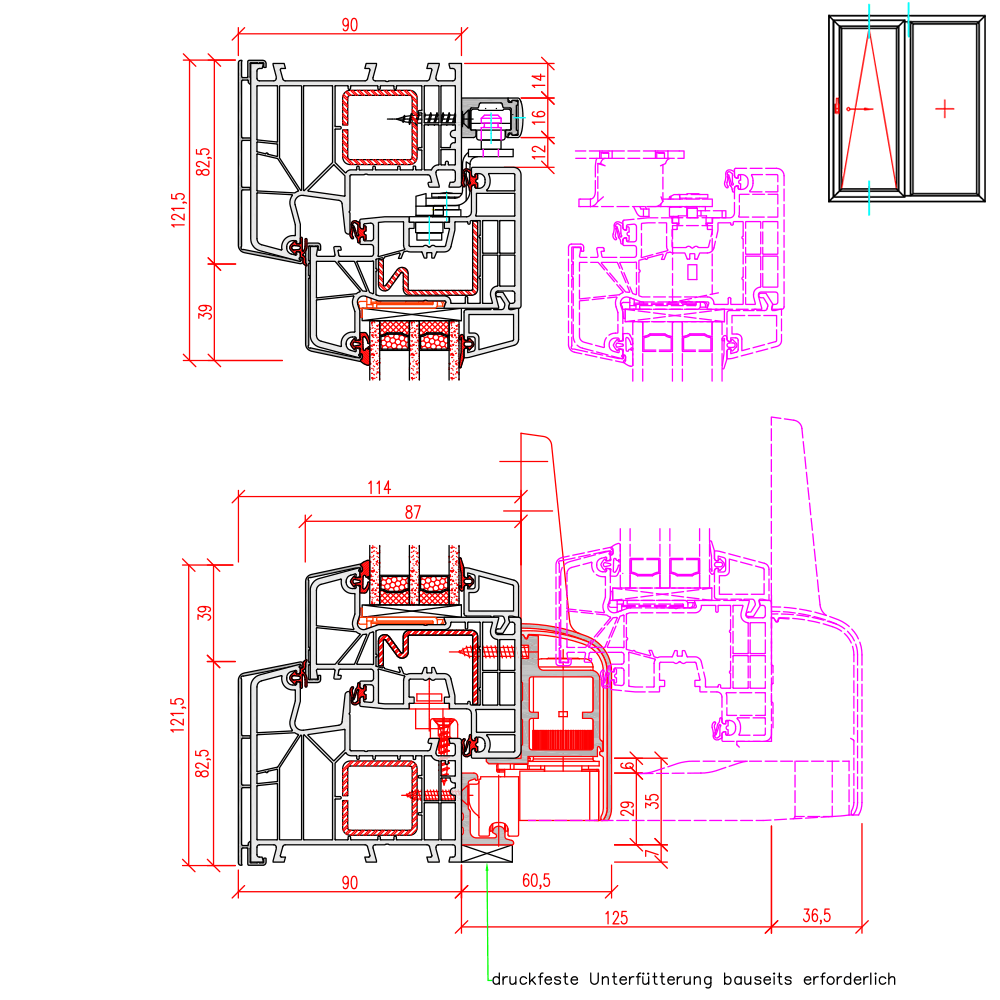 Please note that these are standard drawings. If you would like to know exactly which profiles and components are installed prior to ordering, please contact our customer service at +49 711 860 601 60 or by email info@noSpamwindows24.com. Our experts would be happy to assist you with configuration and answer any questions regarding our products.